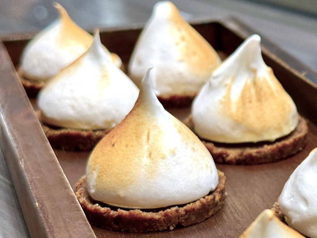[1] Cricket Crumble with Lemon Custard Meringue Pie อาหารคำแรกนี้ เทียบได้กับ Petit Four หรือ “ขนมคำเล็ก” เหมาะกับแสดงออกซึ่งไมตรีจิตแห่งการต้อนรับผู้มาเยือน เป็นอภินันทนาการจากทีมเชฟ (Amuse-Bouche) The Food School และ ผู้จัดกิจกรรม Thailand’s Taste of Tomorrow