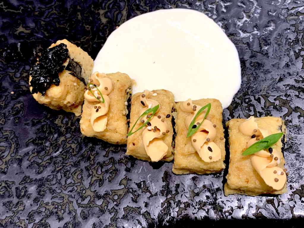[4] Tamagoyaki with Shiitake เชฟ Maxim Baile มีความตั้งใจออกแบบ Japanese Omelet Tamogoyaki ให้เป็นอาหาร Vegan นำวัตถุดิบ ส่วนผสม และ เครื่องปรุงของ ครัวญี่ปุ่นดั้งเดิม เป็นตัวเพิ่มรสชาติให้หลากหลาย ปรุงด้วย Spicy Vegan Cheese บ่มได้กลิ่นรสพอเหมาะประมาณ 1 เดือน เสริมเนื้อสัมผัสด้วยอัลมอนด์บด และ เส้นใยพืช เสริ์ฟพร้อมเห็ด Shiitake ย่างกระทะ