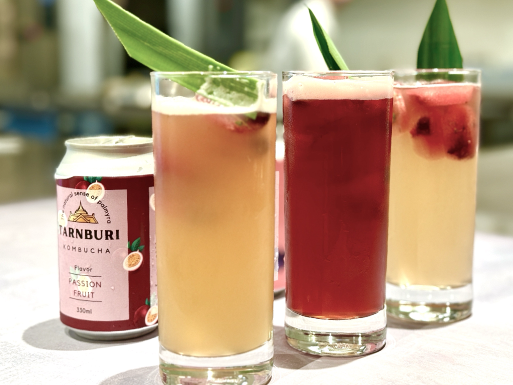 [9] Tarnburi Kombucha with Black Tea Berry Ice Cube นำเสนอ 3 รสชาติ ได้แก่ ตาลโตนด (Palmyra Palm), Mix Berries และ Passion Fruit เข้าคู่กับ Black Tea เติมสีสันให้น่าสนใจด้วย Fruit Infused Ice Cubes เจือกลิ่นผลไม้ และ สมุนไพรสดเหมาะสำหรับเป็นเครื่องดื่มปิดสำรับอาหาร ออกแบบโดย บุญนุช ศรีสุข