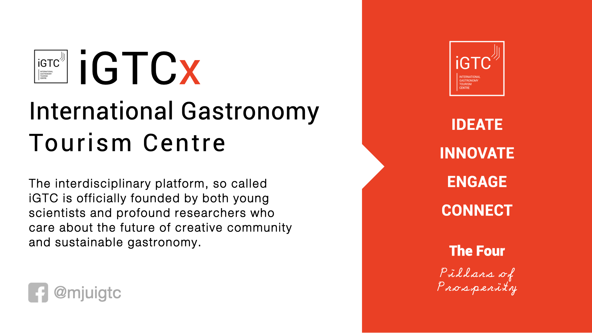 iGTCx คือ ฐานปฏิบัติการทางสังคม (Social Platform) เกื้อกูลชุมชนนักปฏิบัติ (Community of Practices: CoP) ดำเนินงานร่วมกับเครือข่าย มุ่งสร้าง 4 เสาหลักแห่งความมั่งคั่งเชิงนวัตกรรม สู่ความมั่นคงทางอาหาร เพื่อพัฒนาจุดหมายปลายทางด้านการท่องเที่ยวเชิงศิลปวิทยาการอาหารอย่างองค์รวม (The Sustainable Destination of Holistic Gastronomy)