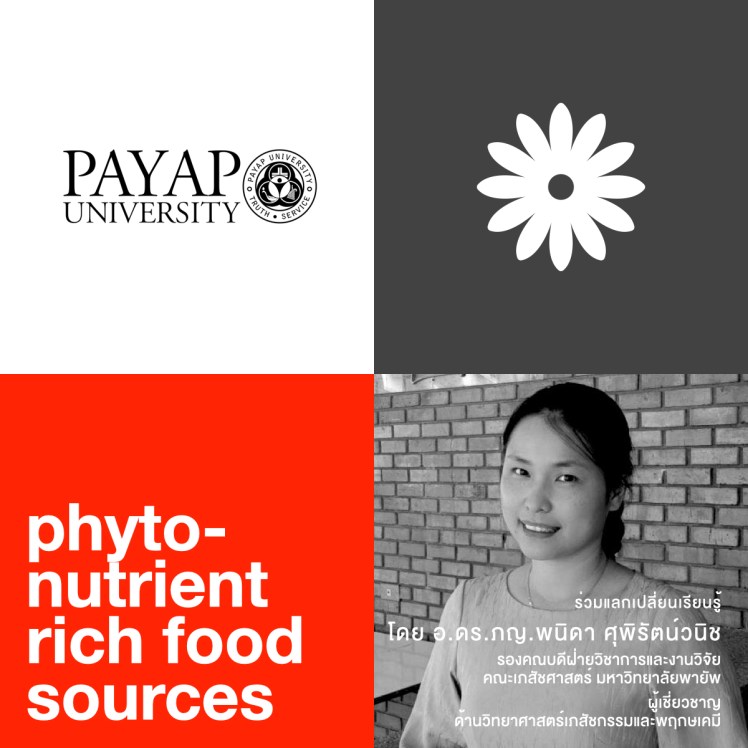 - [ เอกสารประกอบการนำเสนอ ] Phytochemistry of Edible Plants โดย อ.ดร.ภญ.พนิดา ศุพิรัตน์วนิช รองคณบดีฝ่ายวิชาการและงานวิจัย ผู้เชี่ยวชาญด้านวิทยาศาสตร์เภสัชกรรมและพฤกษเคมี คณะเภสัชศาสตร์ มหาวิทยาลัยพายัพ คลิก
