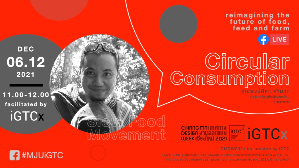 จันทร์ 06.12.2564 | 11:00-12:00 น. การบริโภคหมุนเวียน: “คิด ผลิต ใช้” ในวงรอบ (Circular Consumption) นำแลกเปลี่ยนประสบการณ์ โดย คุณพงษ์ศิลา คำมาก นักขับเคลื่อนสิ่งแวดล้อมผ่านอาหาร อาทิ