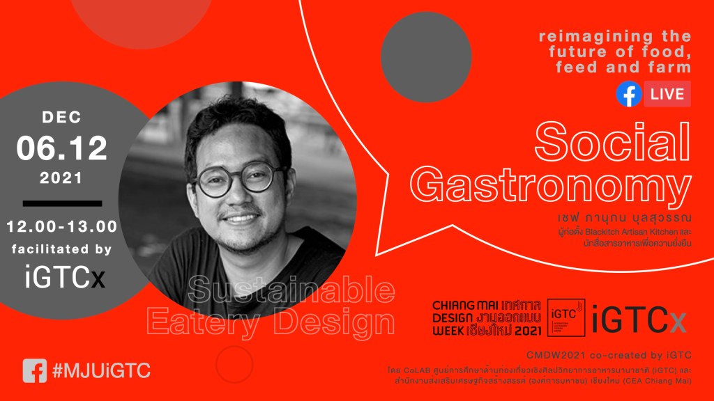 จันทร์ 06.12.2564 | 12:00-13:00 น. สังคมอาหารเปี่ยมสุข: ขับเคลื่อนขบวนการอาหารผ่านจานข้าว (Social Gastronomy) ร่วมแบ่งปันแรงบันดาลใจในการปรุง โดย เชฟ ภานุภน บุลสุวรรณ นำเสนอมุมมองใหม่ที่มีต่อบทบาทของ “คนปรุง” ผู้มีปณิธานอันแรงกล้าต่อการสรรค์สร้างระบบนิเวศอาหาร “แห่งอนาคต (หลังโควิด)” ประกอบไปด้วยเนื้อหาพอสังเขป ดังนี้