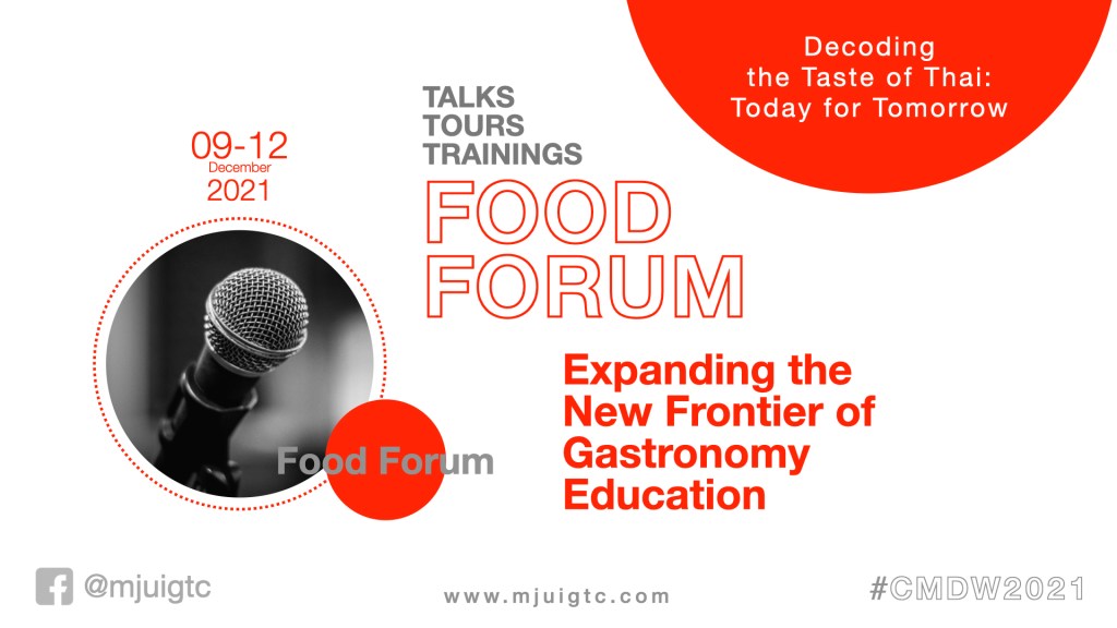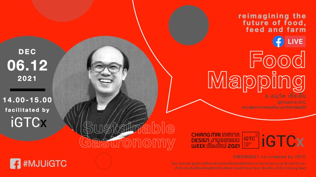 จันทร์ 06.12.2564 | 14:00-15:00 น. แผนที่อาหาร: กลไก กระบวนการ และงานพัฒนา (Food Mapping) ร่วมอภิปราย โดย อาจารย์อนุวัต เชื้อเย็น ผู้อำนวยการศูนย์การศึกษาด้านการท่องเที่ยวเชิงศิลปวิทยาการอาหารนานาชาติ (International Gastronomy Tourism Centre: iGTC) ประกอบไปด้วยสาระสำคัญ ดังนี้