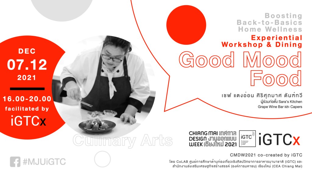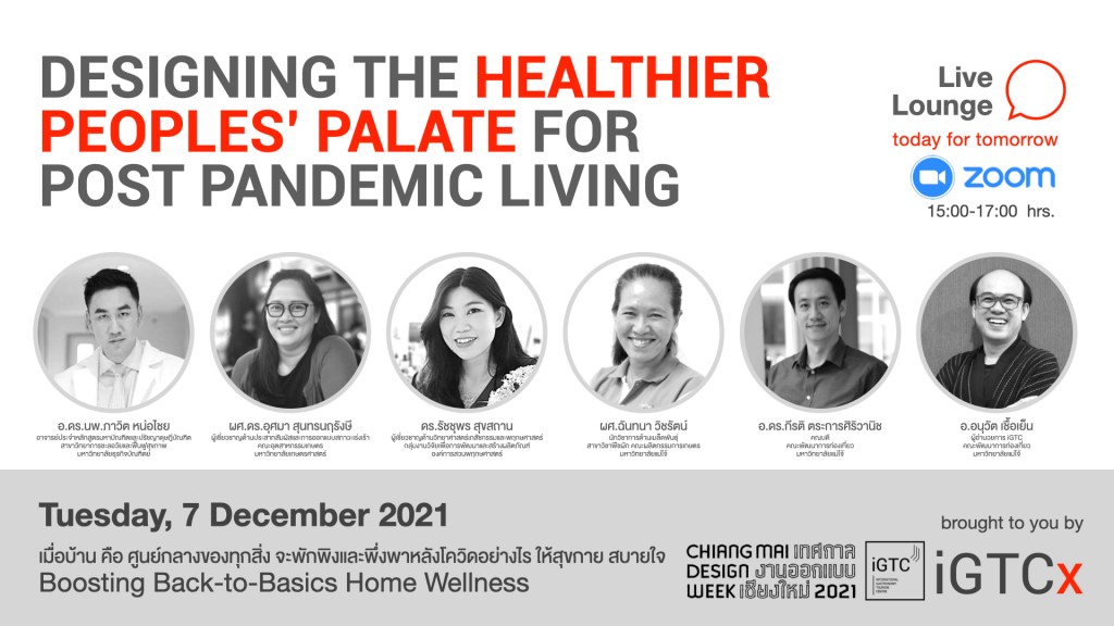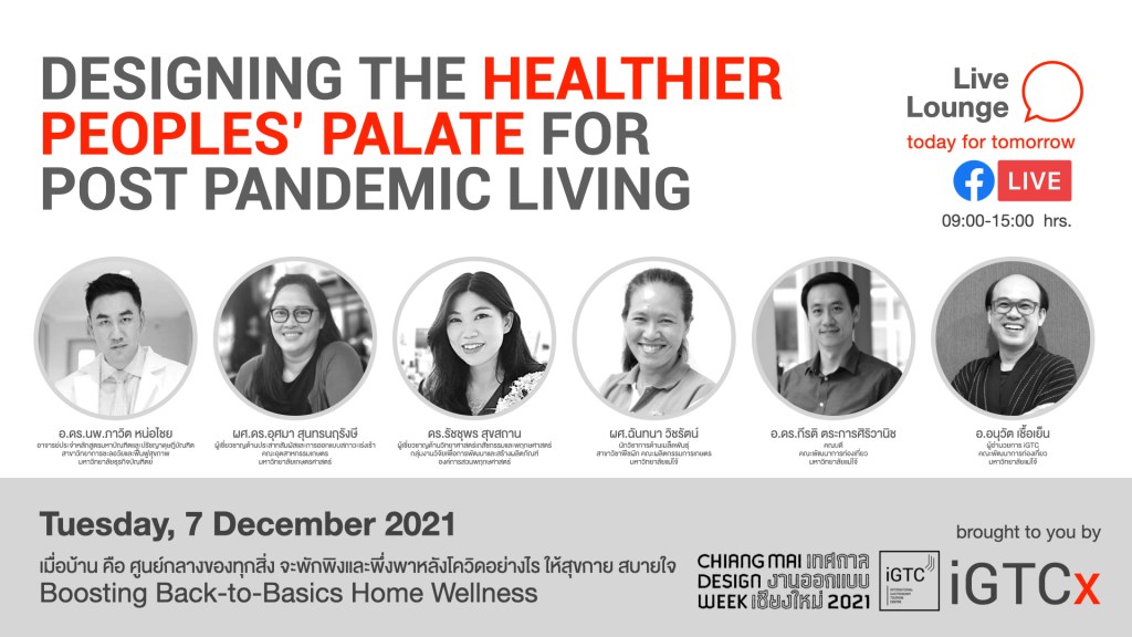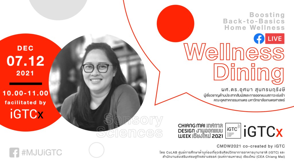 อังคาร 07.12.2564 | 10:00-11:00 น. สร้าง ผัสสะ สิ่งเร้า: เติมความรู้สึก “ใหม่” ให้อาหารจานเดิม (Wellness Dining Design) โดย ผศ.ดร.อุศมา สุนทรนฤรังษี ผู้เชี่ยวชาญด้านประสาทสัมผัสและการออกแบบสภาวะเร่งเร้า คณะอุตสาหกรรมเกษตร มหาวิทยาลัยเกษตรศาสตร์