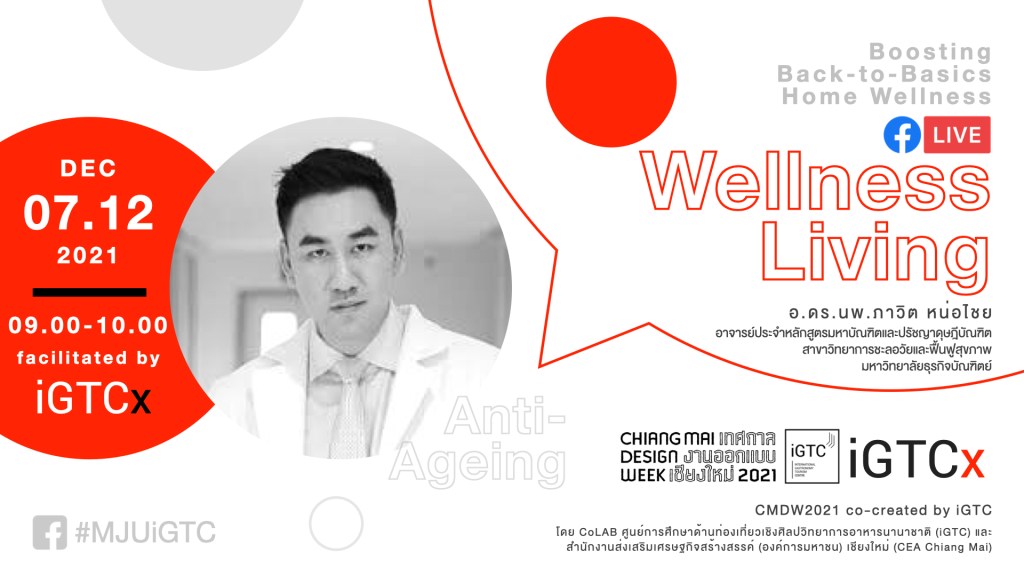 อังคาร 07.12.2564 | 09:00-10:00 น. สุขภาพสมบูรณ์สูงสุด: พลังจากปัจเจก สู่จักรวาลในจานข้าว (Wellness Living Design) โดย อ.ดร.นพ.ภาวิต หน่อไชย อาจารย์ประจำหลักสูตรมหาบัณฑิตและปรัชญาดุษฎีบัณฑิต สาขาวิทยาการชะลอวัยและฟื้นฟูสุขภาพ มหาวิทยาลัยธุรกิจบัณฑิตย์