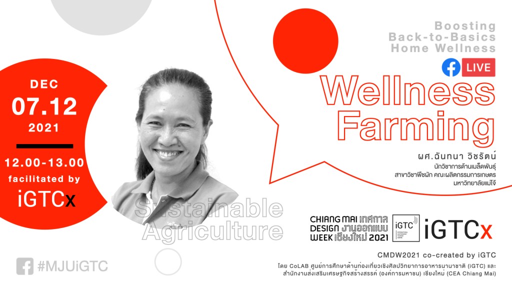 อังคาร 07.12.2564 | 12:00-13:00 น. เกษตรบำบัด: สวนผักสร้างสุข ปรับใช้ “พื้นที่ว่าง” ให้เป็น “พื้นที่ปลูก” (Wellness Farm Design) โดย ผศ.ฉันทนา วิชรัตน์ นักวิชาการด้านเมล็ดพันธุ์ สาขาพืชผัก คณะผลิตกรรมการเกษตร มหาวิทยาลัยแม่โจ้