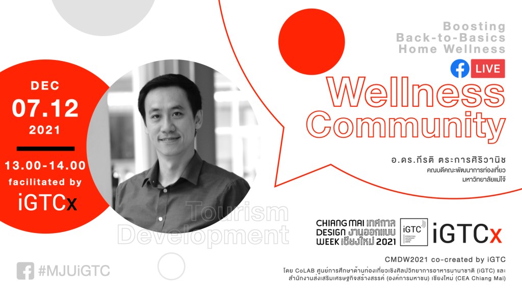 อังคาร 07.12.2564 | 13:00-14:00 น. ชุมชนเปี่ยมสุข: สร้าง “ชุมชน” เพื่อสังคม กินดี อยู่ดี มีสุข (Wellness Community) “สู่สังคม กินดี อยู่ดี มีสุข” นำเสนอผลที่เกิดขึ้นจากขบวนการขับเคลื่อนสังคมเพื่ออาหารและความยั่งยืน ผ่านมุมมองการพัฒนาจุดหมายปลายทางด้านการท่องเที่ยวเป็นเครื่องมือบนฐานการมีส่วนร่วมของชุมชน เตรียมความพร้อมส่งเสริมสนับสนุนกลไกการบริหารจัดการแหล่งท่องเที่ยวผ่านบริษัทที่ดำเนินจัดการเรื่องการขนส่งภาคพื้นดิน (Destination Management Company: DMC) การจัดงานเลี้ยง โรงแรมและนำเที่ยวให้แก่กลุ่มท่องเที่ยวแบบที่ได้รับรางวัลอย่างเป็นระบบและแบ่งปันประโยชน์อย่างเป็นธรรม โดย อ.ดร.กีรติ ตระการศิริวานิช คณบดีคณะพัฒนาการท่องเที่ยว มหาวิทยาลัยแม่โจ้ สามารถประมวลเนื้อหาได้พอสังเขป ดังนี้