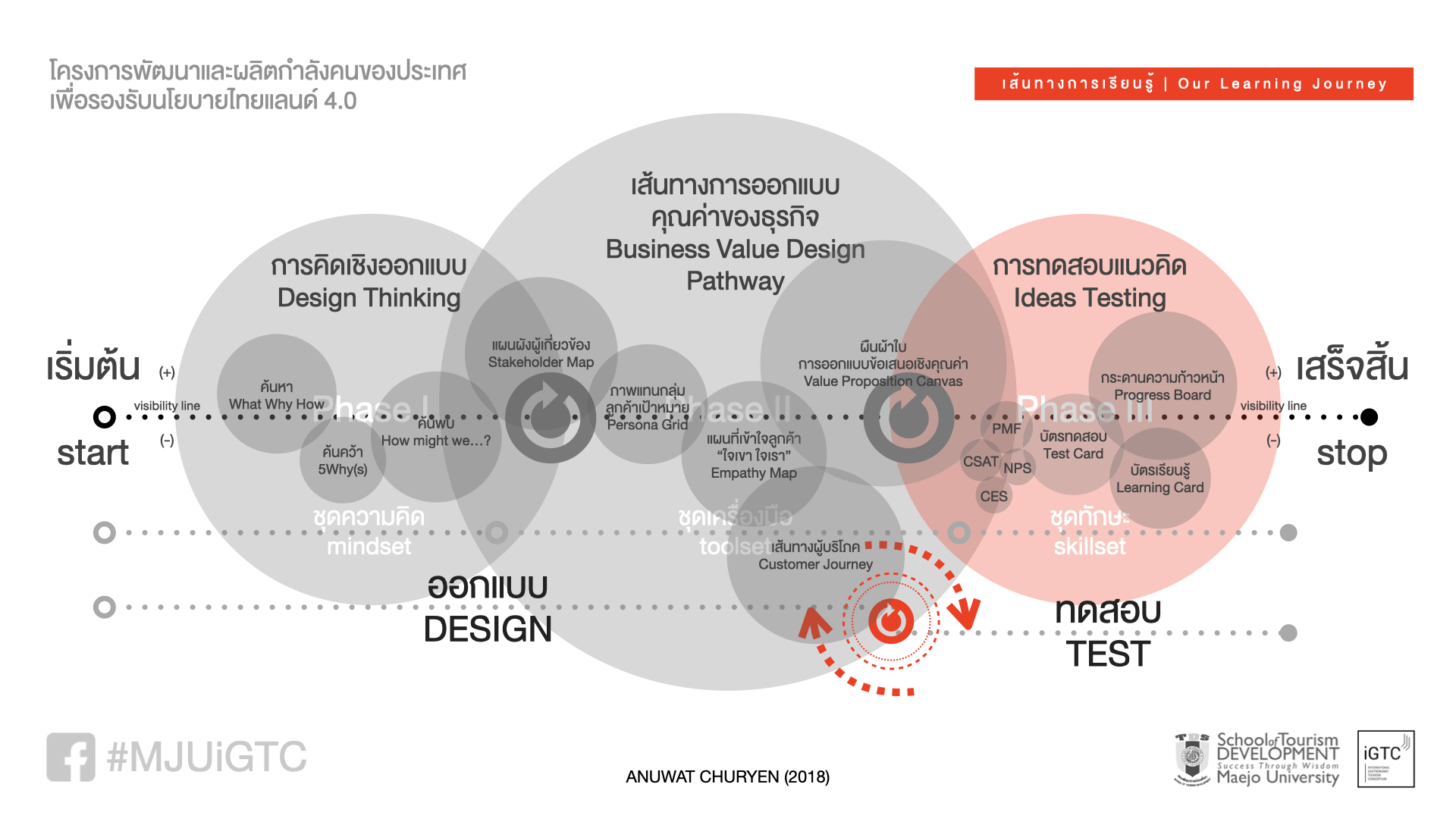 - Debriefing กระบวนการ และผลงานการออกแบบที่ผ่านมา ครอบคลุม Innovation Domain ทั้ง 3 มิติ ได้แก่ ข้อมูลเกี่ยวกับศึกษาวิจัยลูกค้า (customer desirability), ความเป็นไปได้ทางเทคโนโลยี (technology feasibility) และ ความเป็นไปได้ทางธุรกิจ (business viability)