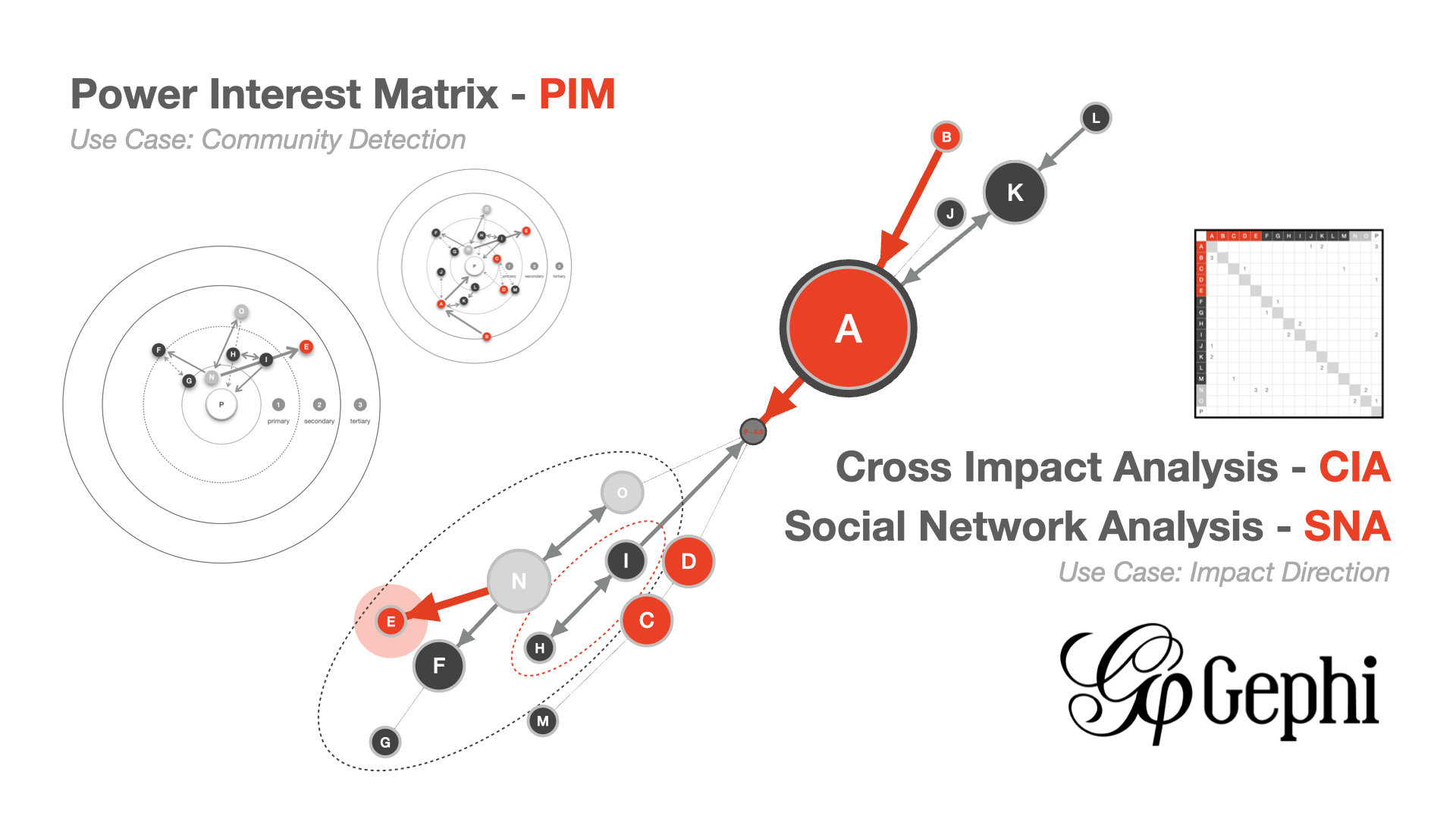 คำตอบ (Answer): นำข้อมูลจากแบบร่างข้อสันนิษฐานเครือข่ายผู้เกี่ยวข้อง (Stakeholder Map) โดยแปลงข้อมูลด้วยแมทริกซ์ประชิด (Adjacency Matrix) แสดงทัศนภาพข้อมูลบนแนวคิดทฤษฏีกราฟ (Graph Theory) ร่วมกับการวิเคราะห์เครือข่ายสังคม (Social Network Analysis: SNA) โดยมีเครื่องมือสำคัญในการวิเคราะห์ ดังนี้ 1) Stakeholder Map 2) Power Interest Matrix 3) Cross Impact Analysis