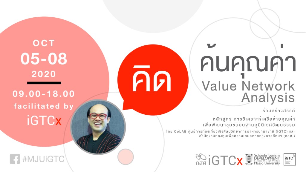 หลักสูตร การวิเคราะห์เครือข่ายคุณค่าเพื่อพัฒนาชุมชนบนฐานภูมินิเวศวัฒนธรรม (Value Network Analysis) โดย CoLAB ศูนย์การท่องเที่ยวเชิงศิลปวิทยาการอาหารนานาชาติ (iGTC) และสำนักงานกองทุนเพื่อความเสมอภาคทางการศึกษา (กสศ.) ภายใต้โครงการยกระดับชุมชนเกษตรอินทรีย์บนฐานภูมินิเวศวัฒนธรรมตลอดช่วงโซ่ของชุมชนตำบลป่าสักของวิสาหกิจชุมชนเกษตรกรธรรมชาติตำบลป่าสัก จังหวัดลำพูน