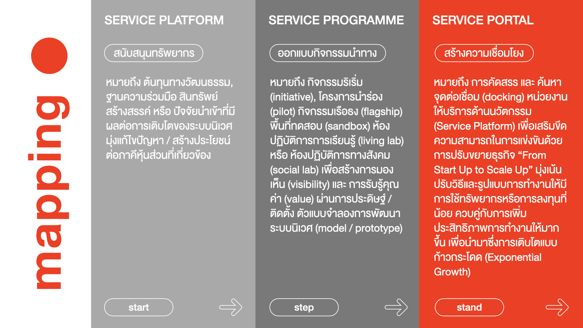 [1] START – SERVICE PLATFORM สนับสนุนทรัพยากร ได้แก่ ต้นทุนทางวัฒนธรรม, ฐานความร่วมมือ สินทรัพย์สร้างสรรค์ หรือ ปัจจัยนำเข้าที่มีผลต่อการเติบโตของระบบนิเวศ มุ่งแก้ไขปัญหา สร้างประโยชน์ต่อภาคีหุ้นส่วนที่เกี่ยวข้อง