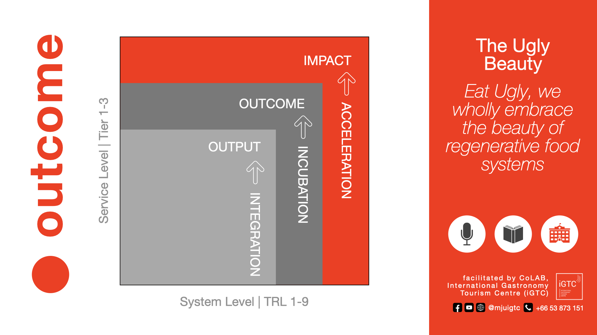พวกเรา คือ หน่วยจัดการและส่งมอบผลลัพธ์ (Outcome Delivering Unit: ODU) ในลักษณะฐานปฏิบัติการความร่วมมือการให้บริการ (Service Platform) โดยกำหนดให้ iGTC เป็นผู้อำนวยความสะดวก (Enabler) เร่งกระบวนการ (Accelerator) สร้างผลลัพธ์ (Outcome) นำส่งผลผลิต (Output) ด้วยการประสานความร่วมมือกับหน่วยงานพันธมิตร และ เครือข่ายพัฒนานวัตกรรม ผลักดันสินค้าและบริการ ตลอดจนผลงานสร้างสรรค์กลุ่ม “Regenerative Food & Gastronomy” ในพื้นที่ภาคเหนือ บนแกนกลางสร้างผลกระทบสูง (High Impact Development) เล็งผลเลิศสู่ความสำเร็จด้วยการเชื่อมต่อหน่วยงานให้บริการด้านนวัตกรรม (Service Portal) และ กิจกรรมนำทาง (Service Programme)